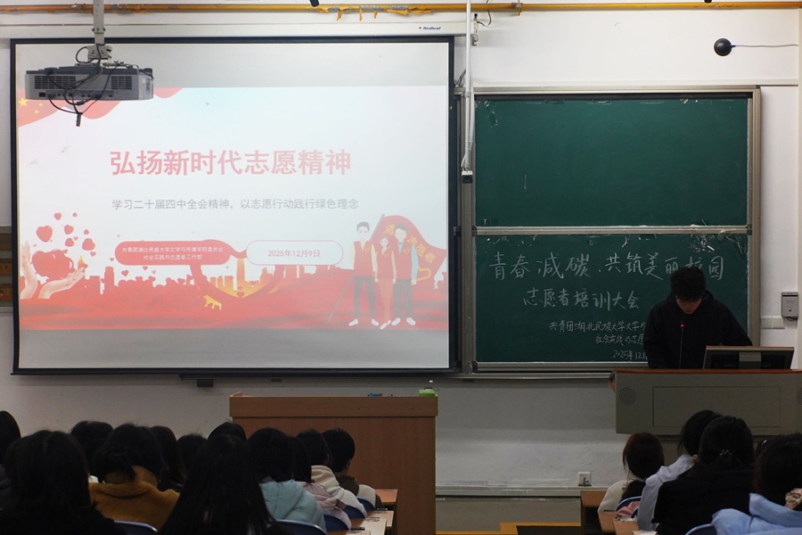 12月9日,共青团365电子娱乐官方网站文学与传媒学院委员会社会实践与志愿者工作部在修远楼5A101教室开展以“青春减碳·共筑美丽校园”为主题的志愿者培训。“铸魂育人”志愿理论宣讲活动部分,社会实践与志愿者工作部干事汪子钧围绕思想引领、绿色行动、实践路径三部分讲述志愿精神的时代内涵,鼓励青年志愿者积极参与志愿服务。宋正悦作分享“榜样引领”志愿故事分享会部分,2024级五星级志愿者宋正悦结合自身服务经历分享志愿路上的“...