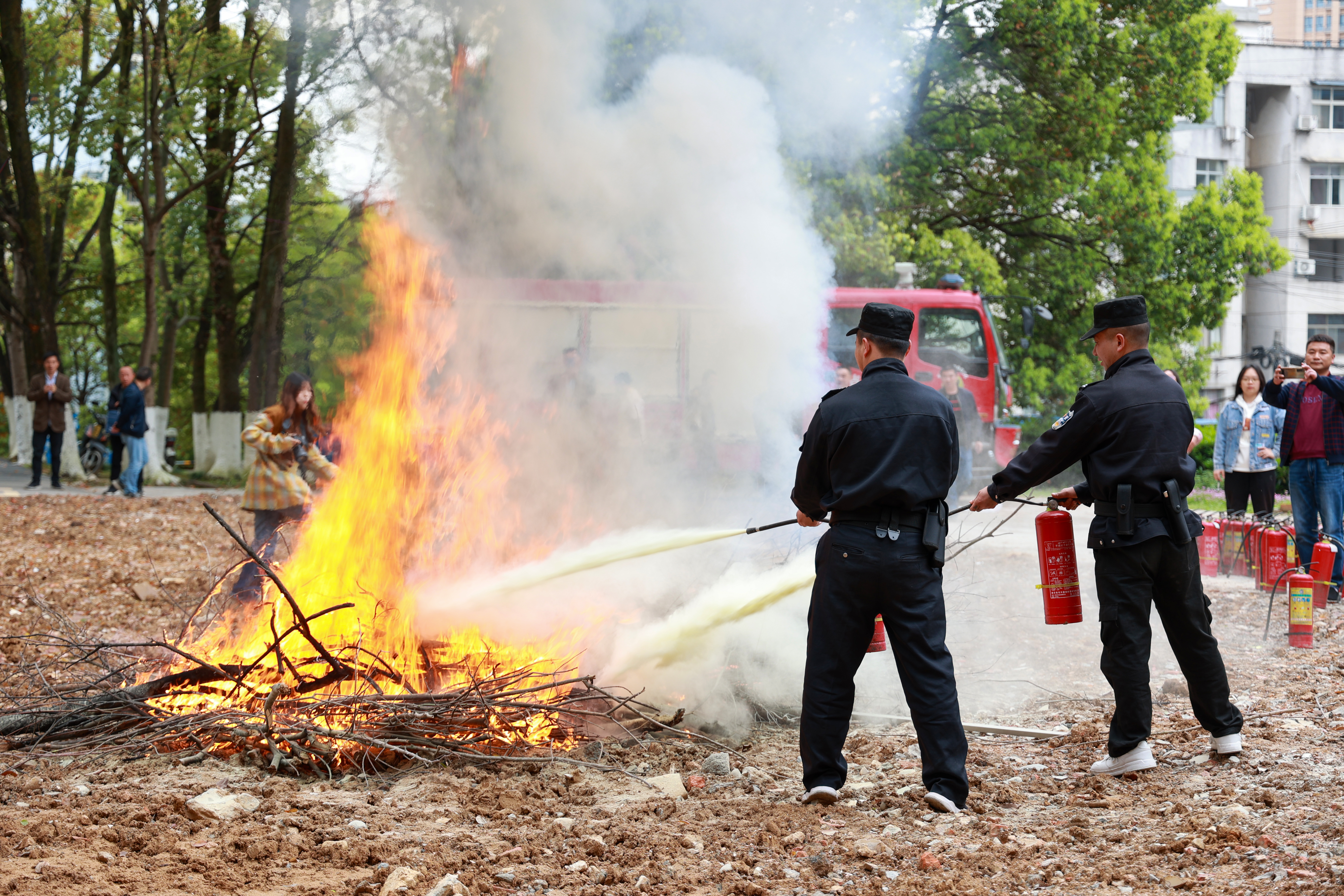讲座结束后,恩施市消防大队的六位消防员与参训人员一起来到学校南门处空旷地带,进行常用灭火器材实操培训。消防员向大家详细讲解了灭火器的使用方法及操作规程,并进行了灭火器的操作示范。参训人员热情高涨,积极参加实操训练。大家普遍认为,自己通过此次培训懂得了如何避险、如何防范日常火灾隐患、如何使用灭火器,掌握火灾发生时基本的应对措施,有效提高了个人安全意识与自护自救技能。