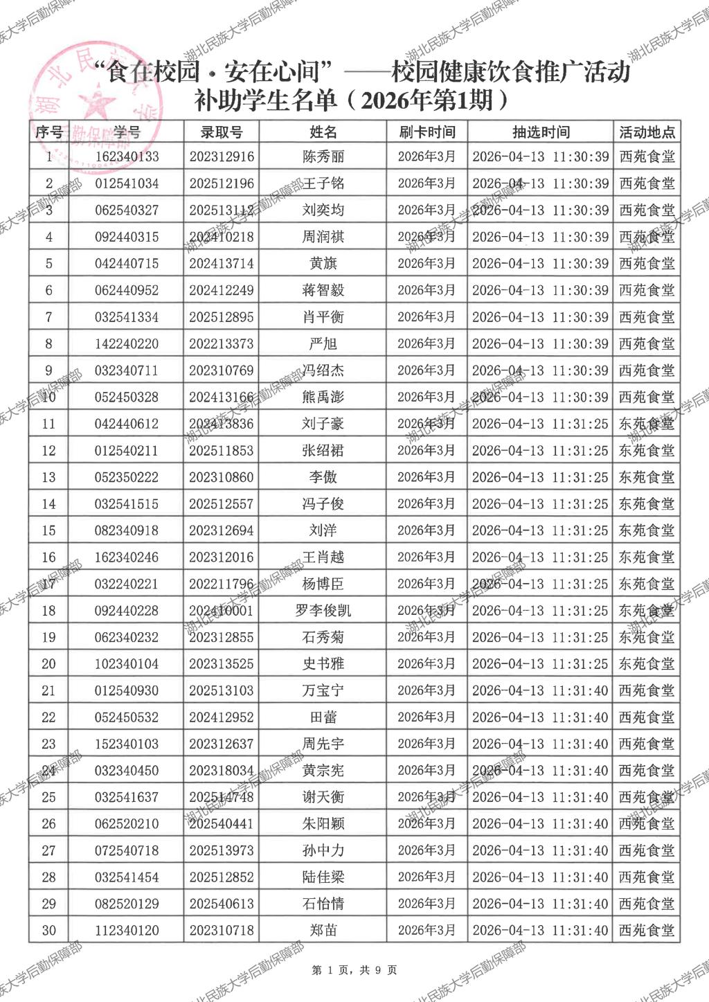 “食在校园·安在心间”——校园健康饮食推广活动(2026年第1期)补助学生名单公示
