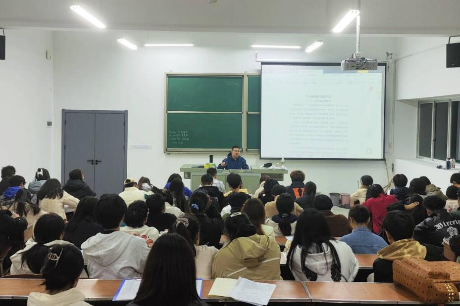 我院本科学生党支部宣传兼纪检委员彭召元开展第三次授课,他以“学习与实践马克思主义”为主题,向同学们介绍马克思主义的重要作用与现实意义,指出在新时代我们仍要学习和实践马克思主义。彭召元着重讲解学习马克思主义要从学习和实践马克思主义关于人类社会发展规律的思想,坚守人民立场的思想、生产力和生产关系的思想、人民民主的思想、文化建设的思想、社会建设的思想、人与自然关系的思想、世界历史的思想、马克思主义政党建设的思想这些方面来落实。最后,彭召元提到理论的生命力在于不断创新,新时代广大青年要用中国化时代化的马克思主义理论武装头脑、指导实践、开展工作。