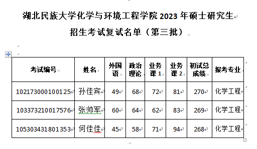 365电子娱乐官方网站化学与环境工程学院2023年硕士研究生 招生考试复试名单(调剂第三批)