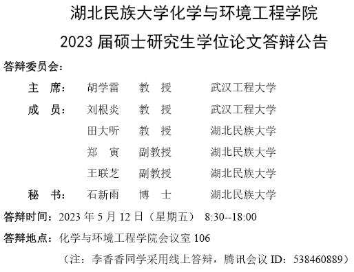365电子娱乐官方网站化学与环境工程学院2023届硕士研究生学位论文答辩公告(2)