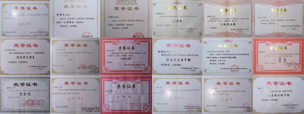 徐明珠,湖北孝感人,中共预备党员,2020级化学专业学生。在2022-2023学年中,综合素质测评成绩排名专业第一,荣获湖北省第十六届大学生化学(化工)学术创新成果报告会三等奖、湖北省第十一届普通高校师范专业大学生教学技能竞赛初中化学组三等奖等奖项,多次获得学校“三好学生”,学院“优秀辩手”等称号。