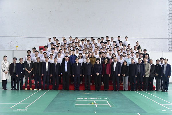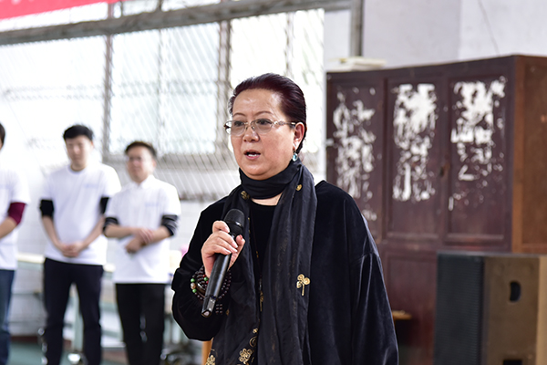 在我校篮球馆,孙学玉一行听取了该剧前期创作背景和现有进度的汇报,并观摩了排演情况。