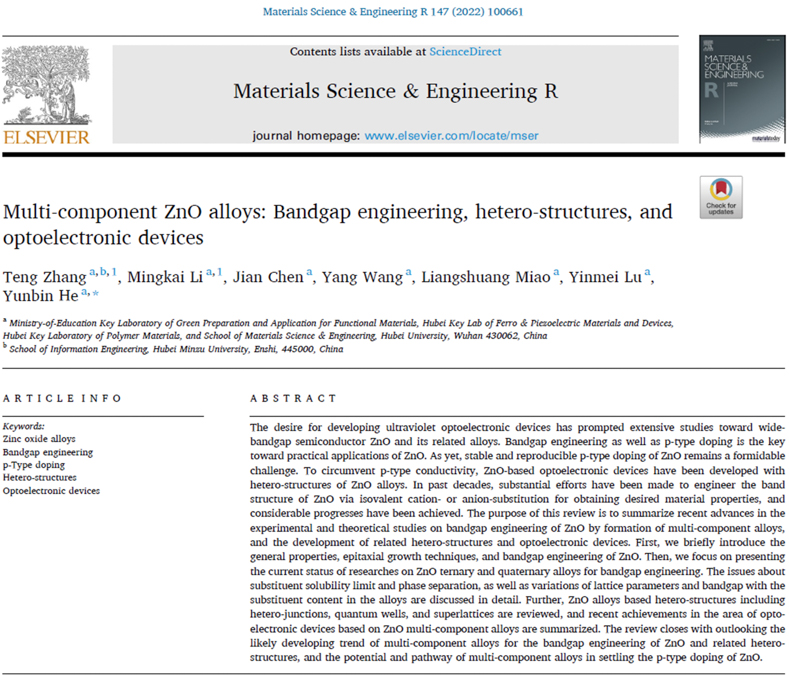 近日,我校信息工程学院青年教师张腾博士以第一作者身份在材料科学与工程领域国际顶级期刊《Materials Science and Engineering R》(2020年度影响因子为36.2)上发表了有关第三代宽禁带半导体及其器件应用的学术论文“Multi-component ZnO alloys: Bandgap engineering, hetero-structures, and optoelectronic devices(多元ZnO合金:能带工程、异质结及其光电器件)”。这是我校教师在高影响力论文发表上的一大突破。该期刊为国际顶级综合性期刊,每年发表论文数量仅十余篇,对材料领域的发展具有重要的引领和指导作用。