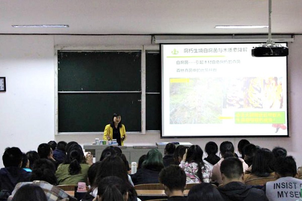 本网讯(记者 黄霜叶 朱嘉莹/文 朱嘉莹/图)10月24日,华中科技大学教授张晓昱在我校生物科学与技术学院4101教室作“当木质素邂逅白腐菌当污染物撞上白腐菌”的专题讲座。该院院长张弛主持讲座,部分教师及生物工程专业学生到场聆听。