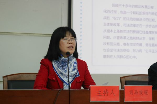 司马俊莲作总结。她表示,本次报告回顾过去法治改革的历史,阐述新一轮改革内容,剖析了司法体制的现状,向师生展现了法治中国建设的最新进程。司法体制是整个法治体系的重要环节,司法文明是政治文明的重要组成部分,推进司法体制的深化改革,对社会主义法治国家具有重要意义。(责任编辑 谭杰 段荦艺)