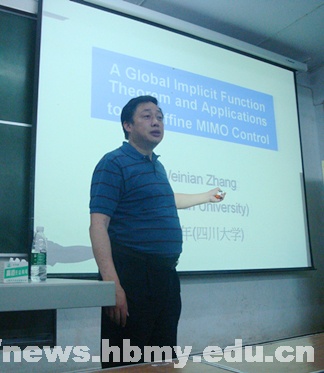 本网讯(记者 龙慧芬 张莉/文 魏倩/图 )4月18日晚,四川大学博士生导师张伟年在理学院3303教室作了题为“一个全局隐函数定理及在MIMO控制中的应用”的讲座。理学院党委书记向大晶、院长刘志军、数学老师李祖雄、向会立等听取了讲座。