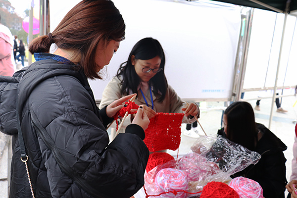 我校文学与传媒学院在大学生广场举办以“团团毛线我手织,长长围巾暖寒冬”为主题的志愿活动,成团的毛线将志愿者与留守儿童联系起来,传递着爱与温暖。