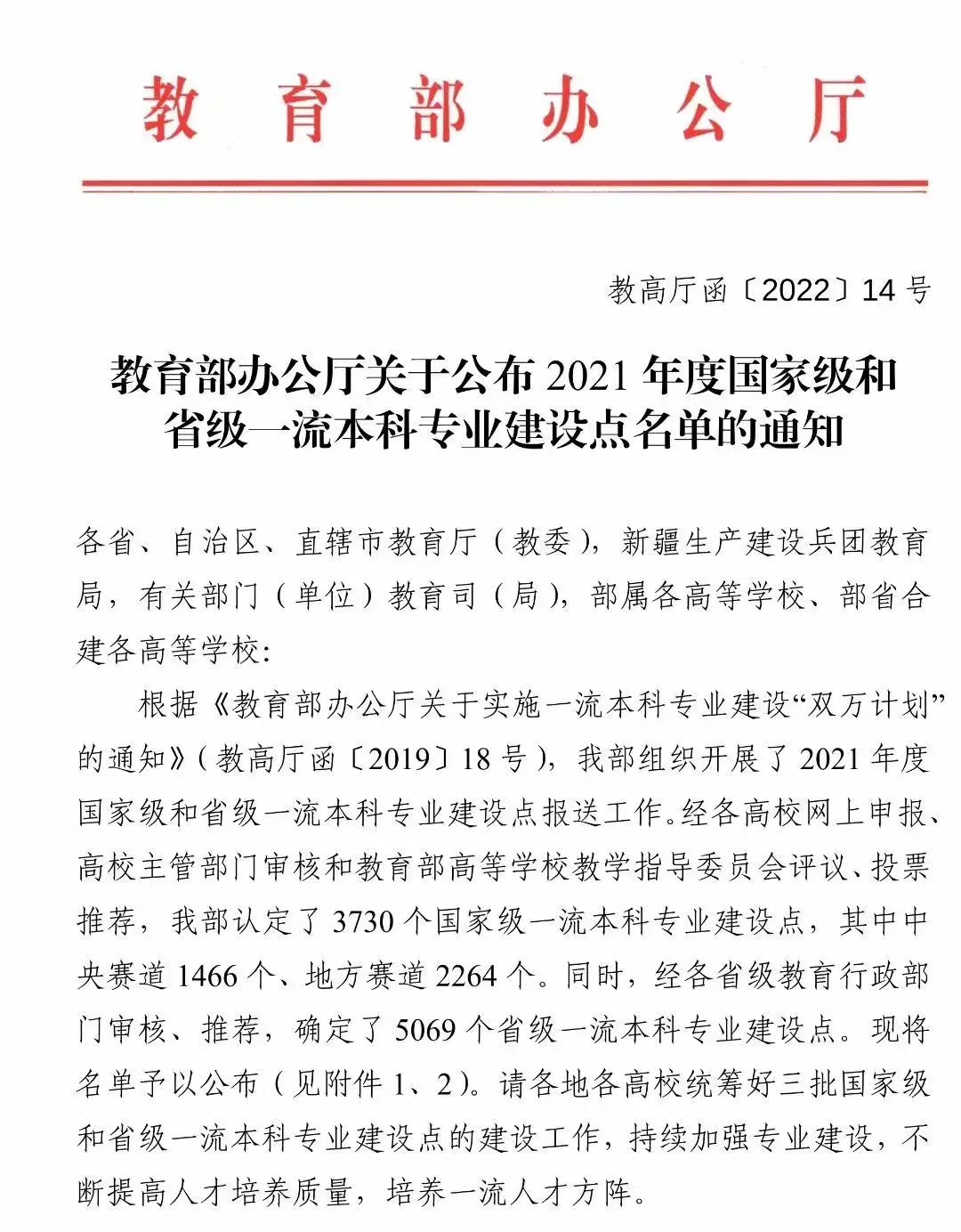 根据教育部办公厅2022年6月11日发布的《教育部办公厅关于公布2021年度国家级和省级一流本科专业建设点名单的通知》(教育厅函〔2022〕14号),365电子娱乐官方网站会计学专业入选2021年度国家级一流本科专业建设点名单。