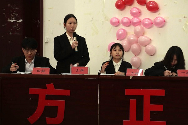 本网讯(记者 张晓京 岑宇婷/文 记者 叶然 胡蝶/图)2022年3月26日,经济与管理学院“希望杯”辩论赛在修远楼5B404教室举行。经济与管理学院优秀辩手皮南瑾、金思羽、王岩、苏珊出席本次比赛并担任评委。最终,正方二辩吴倩荣获“最佳辩手”称号,反方二辩葛梦晗荣获“最佳人气辩手”称号,正方一辩白金伶、正方三辩陈乐景和正方四辩王顺荣获“优秀辩手”称号。