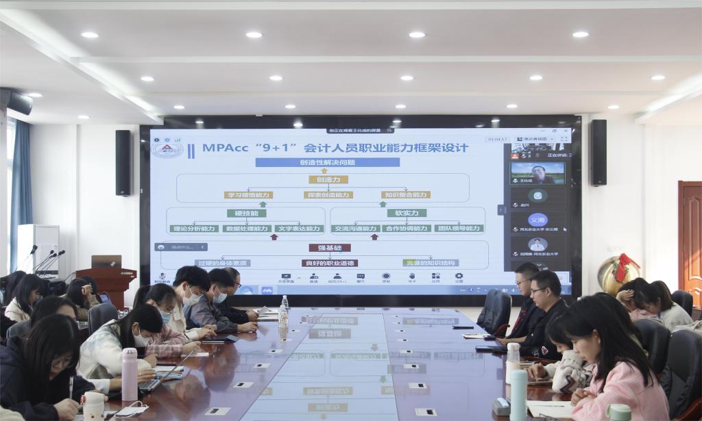 赵慧峰讲话。她从基本情况、办学现状、社会服务、经济管理学院历史沿革 、MPAcc培养特色、实验中心建设等方面对河北农业大学进行介绍。在MPAcc培养特色这一方面,她提到,该校在夯实通用型高级会计人才培养的基础上遵循“入主流、强特色”的学科发展理念,着重培养学生涉农领域专业特长,注重理论实验与实践相结合,坚持面向京津冀、雄安新区,依托地域资源优势,以创新意识和实践能力为核心,突出区域行业人才需求的针对性和适用性。