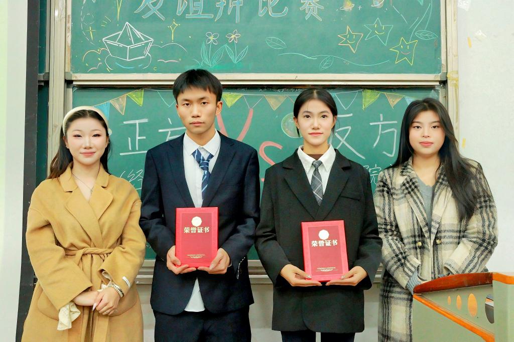 本网讯(见习记者 杜秋畅 施瑾 冯柯嘉/文 记者 郑诗彤/图)2024年11月29日,经济与管理学院联合外国语学院举办的友谊辩论赛在修远楼5B404教室举行。经济与管理学院优秀辩手李昕恩、方琦,外国语学院优秀辩手李晓雅应邀出席本次比赛并担任评委。最终,正方三辩易泽铭和反方三辩刘昕炎荣获“优秀辩手”称号。