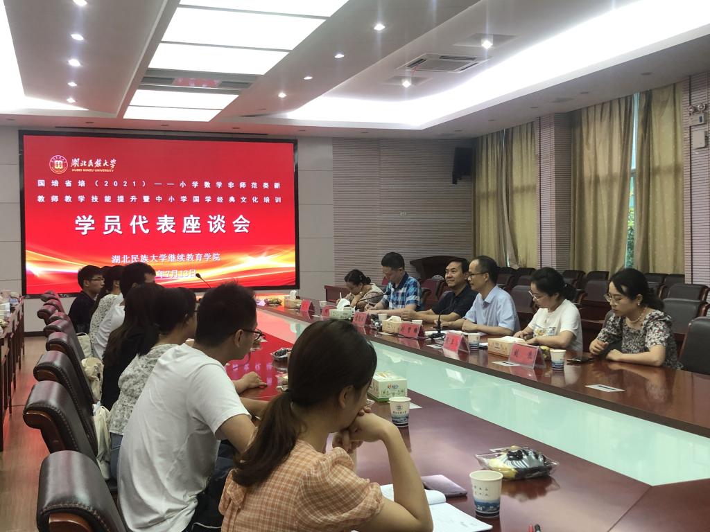 713日晚,我院组织召开国培省培(2021——小学数学非师范类新教师教学技能提升暨中小学国学经典文化培训学员代表座谈会。院长雷随斌、副院长刘贤锋出席,本期两个培训班的40名学员代表、班主任及考试培训科工作人员参加座谈会。
