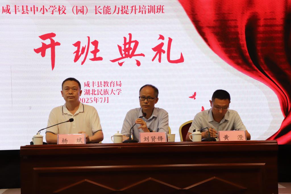 受咸丰县教育局委托、由我校承办的“咸丰县中小学校(园)长能力提升培训班”于7月15日在华龙村大酒店开班。咸丰县第一中学党委副书记、校长黄澄,学院副院长刘贤锋出席开班仪式。咸丰县55名中小学校(园)长参加培训。