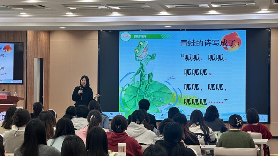 3月25日,系列活动首场讲座由恩施市实验小学语文骨干教师卢丽芳担纲。作为“湖北省精品课一等奖”获得者、恩施市优秀教师,卢丽芳以扎实的教学功底和多元的教学技能,为师范生呈现了一堂充满童趣的一年级语文课《青蛙写诗》模拟课堂。