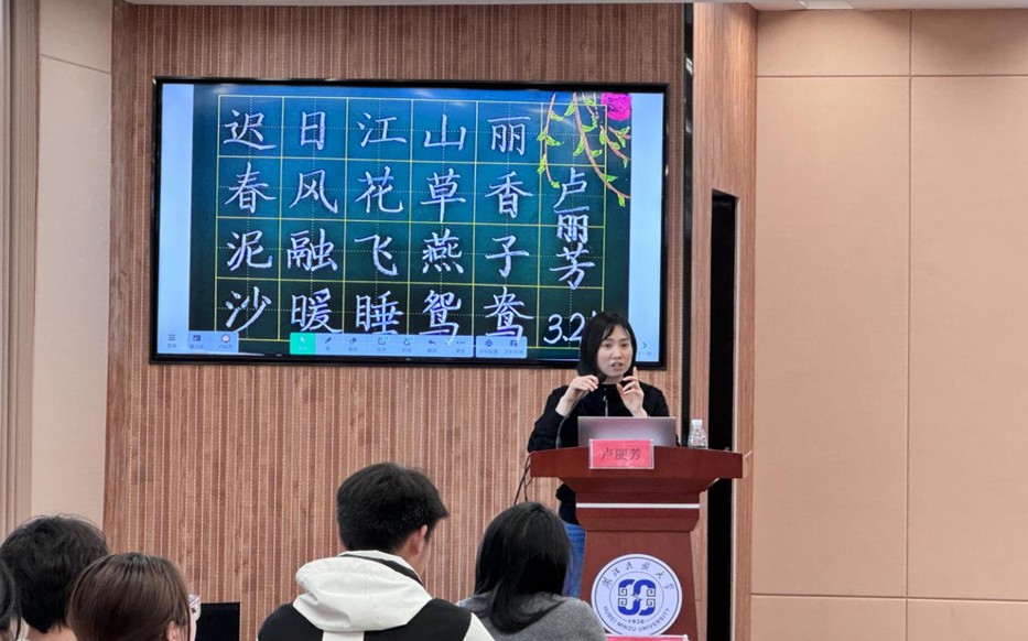 课堂上,卢丽芳巧妙运用情景演绎法,将池塘、荷叶、水珠等元素搬上讲台,通过角色扮演、儿歌创编、书法示范等互动环节,让抽象的汉字符号转化为可感的生活图景,生动展现了汉字的文化魅力。卢丽芳的趣味教学理念贯穿课堂始终,其幽默亲和的教风、张弛有度的课堂把控,让在场师范生深切体会到“教育是科学与艺术的统一”。