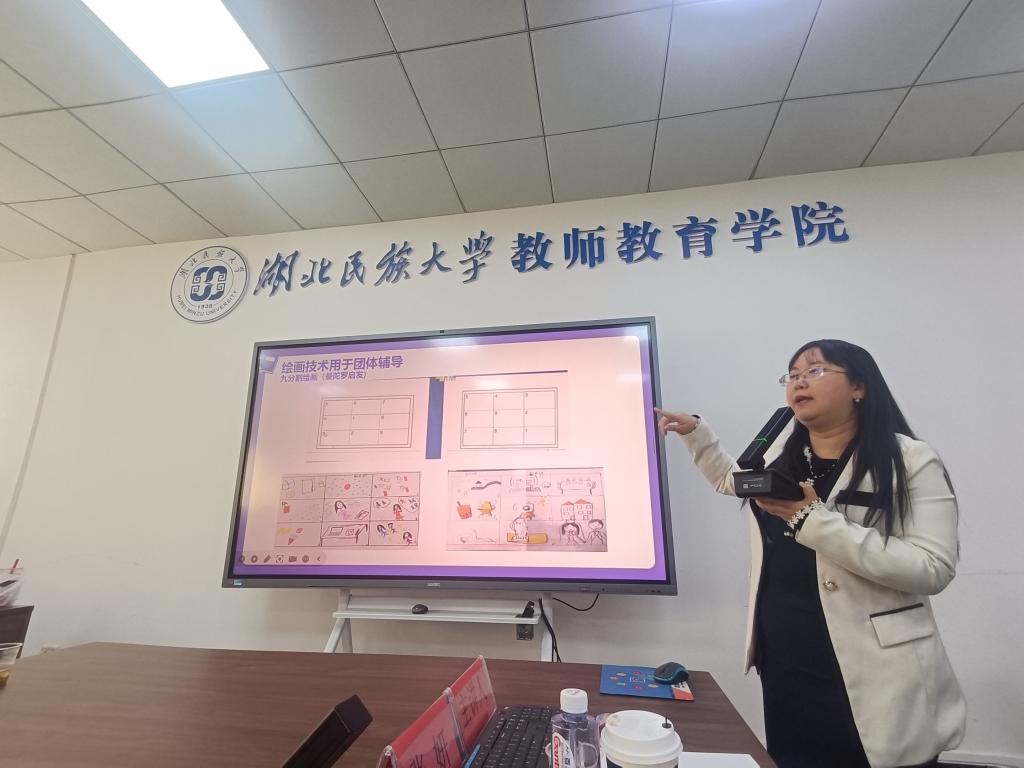 为拓展专业视野、探索学科前沿,11月28日下午,我院邀请华中科技大学教育科学研究院教授、博士生导师,国家二级心理咨询师张妍在9A505做了《绘画疗法在心理咨询中的应用》专题讲座。该讲座由学校心理健康教育中心主任兼教师教育学院副院长黄力主持,湖北恩施学院及我校心理健康教育中心专职咨询师、心理学相关课程教师、小学教育专业大三学生60余人参加了本次讲座。