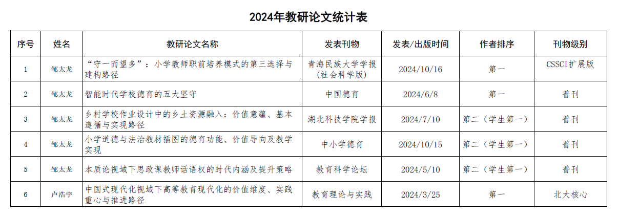 2024年教研论文统计表