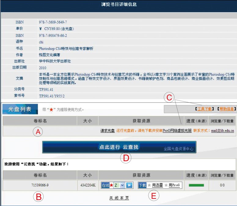 E:找到某资源后,您可以采用在线或下载该光盘进行查阅。