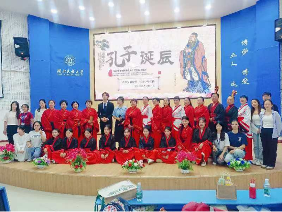 活动现场,师生齐聚一堂,用丰富多彩的形式纪念孔子。通过观看短视频了解孔子的教育理念、道德观念;图书馆勤工助学小组学生诵读《论语》部分篇章诠释经典的力量;施州怡心读书会带来自编自创的情景剧《孔子之歌》,让大家充分感受到孔子思想的博大精深与历久弥新的魅力;知识竞答与观众互动环节生动有趣。最后图书馆教师表演的小组合唱《礼运大同篇》以其深邃的哲思和美妙的旋律,表达了人们向往“大道之行,天下为公”的美好夙愿。
