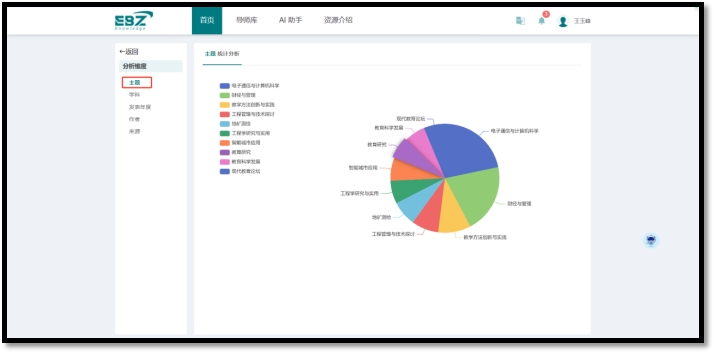 点击分析按钮,系统将根据你输入关键字搜索出的文献进行主题、学科、发表年度、作者、来源详细分析。详情如下:
