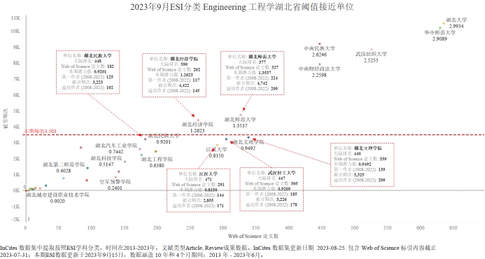 本期我校有望进入ESI前1%的学科为Engineering 工程学,潜力值为0.9201,论文数182,引用量3223,本期入围阈值为3503。