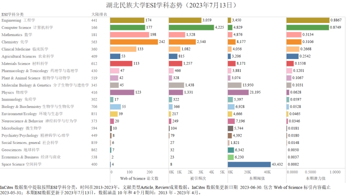 根据2023年7月13日ESI最新更新数据,数据涵盖10 年和 4个月期间:2013年 - 2023 年 4月。我校重点关注学科,本期Engineering工程学入围ESI学科前1%全球机构2242所,其中国内机构404所。Computer Science计算机科学入围ESI学科前1%全球机构721所,其中国内机构141所。