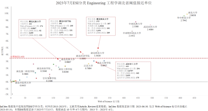 本期我校有望进入ESI前1%的学科为Engineering 工程学,潜力值为0.8867,论文数174,引用量3059,本期入围阈值为3450。