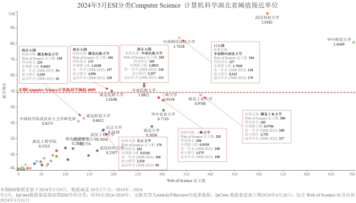 本期我校有望进入ESI前1%的学科为Computer Science 计算机科学,潜力值为1.0198,论文数196,引用量4996,本期入围阈值4899。由于潜力值比实际略有偏高,尽管本期Computer Science 计算机科学潜力值为1.0198大于1,仍尚未入围ESI学科前1%。