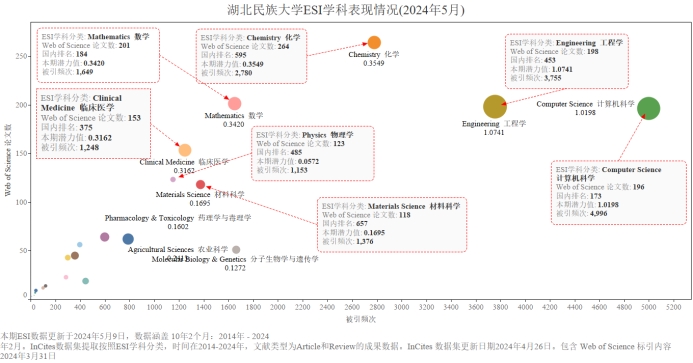 根据基本科学指标数据库(Essential Science Indicators,简称ESI)2024年5月9发布的最新数据显示(2024年5月9日更新,数据涵盖10年2个月:2014年 - 2024 年2月),本期共有9019家研究机构进入ESI全球前百分之一,我校尚未有学科进入ESI学科前1%。