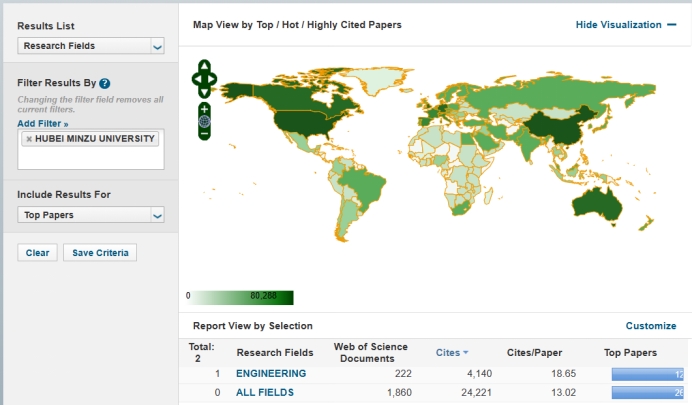 表2为本期我校ESI分类各学科态势情况,发文量、被引频次与潜力值的分布,球越大表明潜力值越高,当中Engineering工程学已经入围,潜力值最高的为计算机科学。