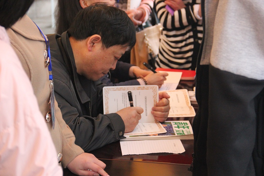 胡尔西旦•爱妮娃尔喜滋滋的观看自己的捐赠证书