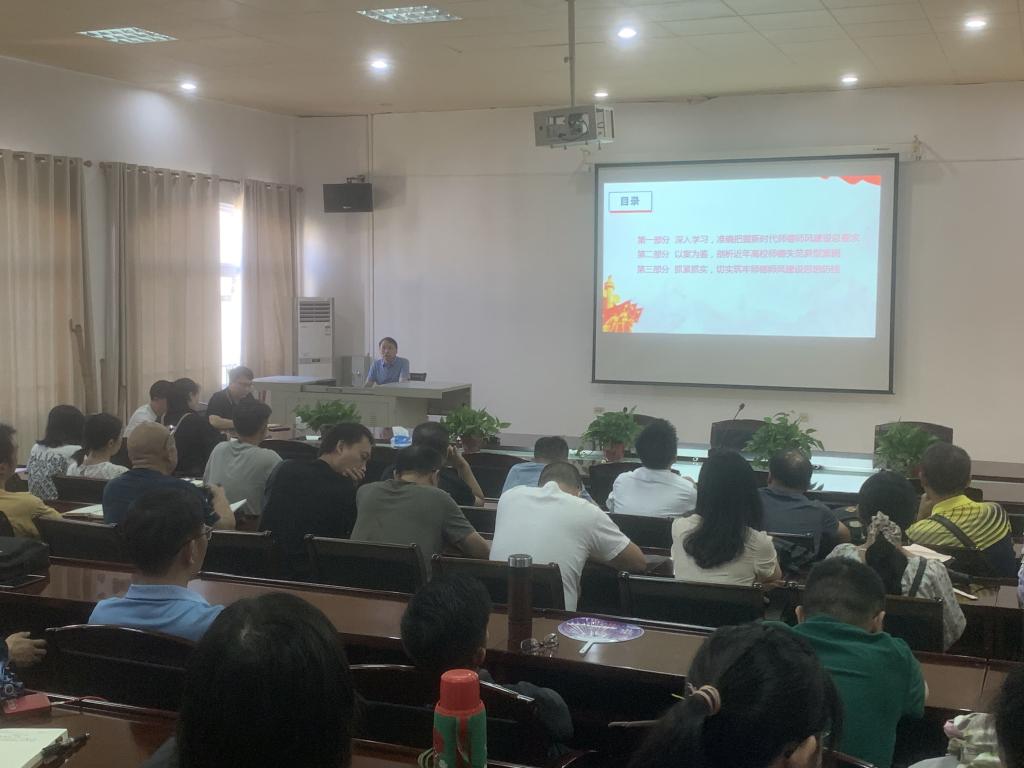 柳德雄以“践行师德规范,坚持廉洁从教”为题。从三个方面展开,一是深入学习,准确把握新时代师德师风建设总要求,从习近平总书记关于教师的重要论述,教育部关于师德师风建设的总体要求,学校关于师德师风建设的具体措施等三方面进行了深入讲解;二是以案为鉴,剖析近年高校师德失范典型案例,全院教职工从具体案例中深受启发和教育,以案为鉴、警钟长鸣;三是抓紧抓实,切实筑牢师德师风建设思想防线,要求从思想政治、教育教学、学术规范、生活作风等方面严格自律,提升师德师风素养。