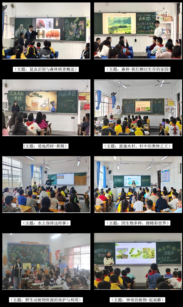讲师团成员分别前往三至六年级的十个班级开展主题宣讲。各班班主任精心设计了与宣讲主题相呼应的板报,增添了宣讲氛围。本次宣讲包含十个主题,分别为:“昆虫识别与森林病害概论”、“森林—我们赖以生存的家园”、“道地药材—黄精”、“恩施水杉—杉中的奥特之王”、“水土保持这些事”、“因生物多样,拥精彩世界”、“野生动植物资源的保护与利用”、“神奇的植物-泥炭藓”、“水中燕窝-莼菜”、“牡丹绽放,国色天香”。