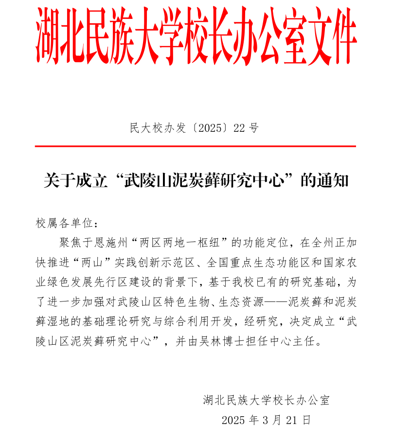 2025年3月,学校成立武陵山区泥炭藓研究中心,我院吴林博士担任中心主任。