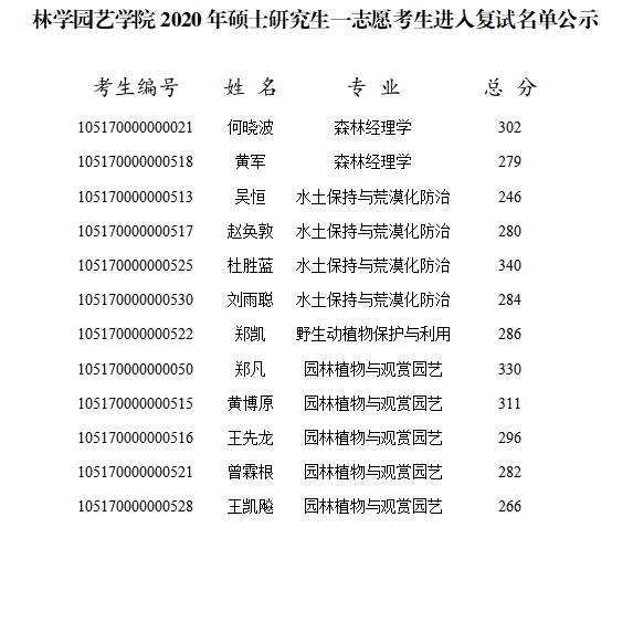 林学园艺学院2020年硕士研究生一志愿考生进入复试名单公示