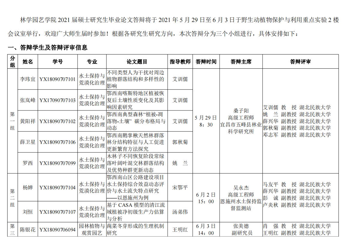 林学园艺学院2021年春季研究生毕业答辩公告
