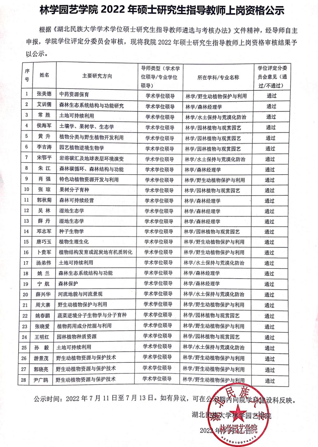 林学园艺学院2022年硕士研究生指导教师上岗资格公示