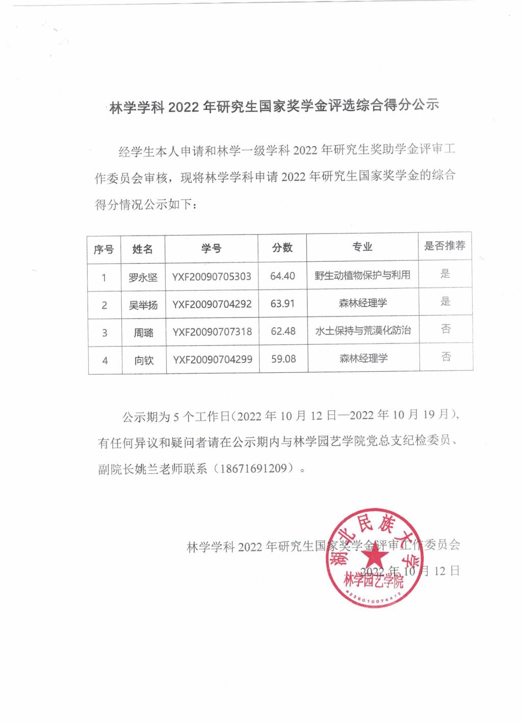 林学园艺学院2022年研究生国家奖学金评选综合得分公示