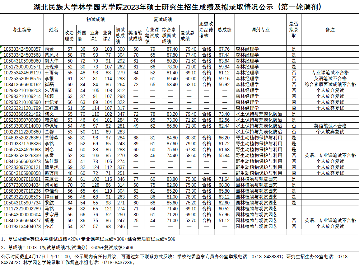 林学园艺学院2023年硕士研究生招生成绩及拟录取情况公示(第一轮调剂)