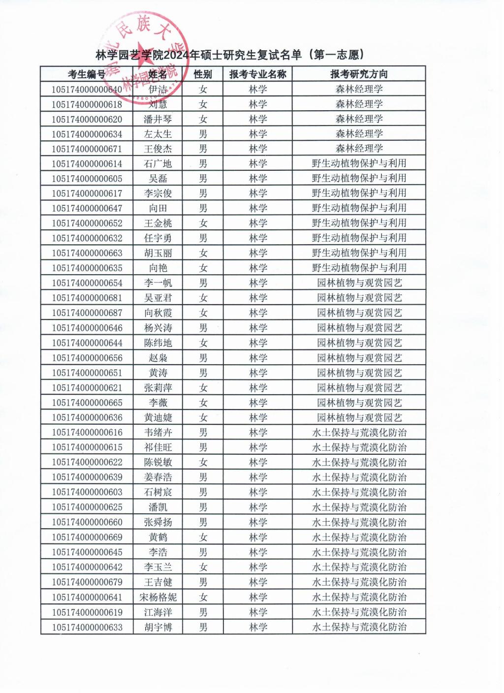 林学园艺学院2024年硕士研究生复试名单(第一志愿)