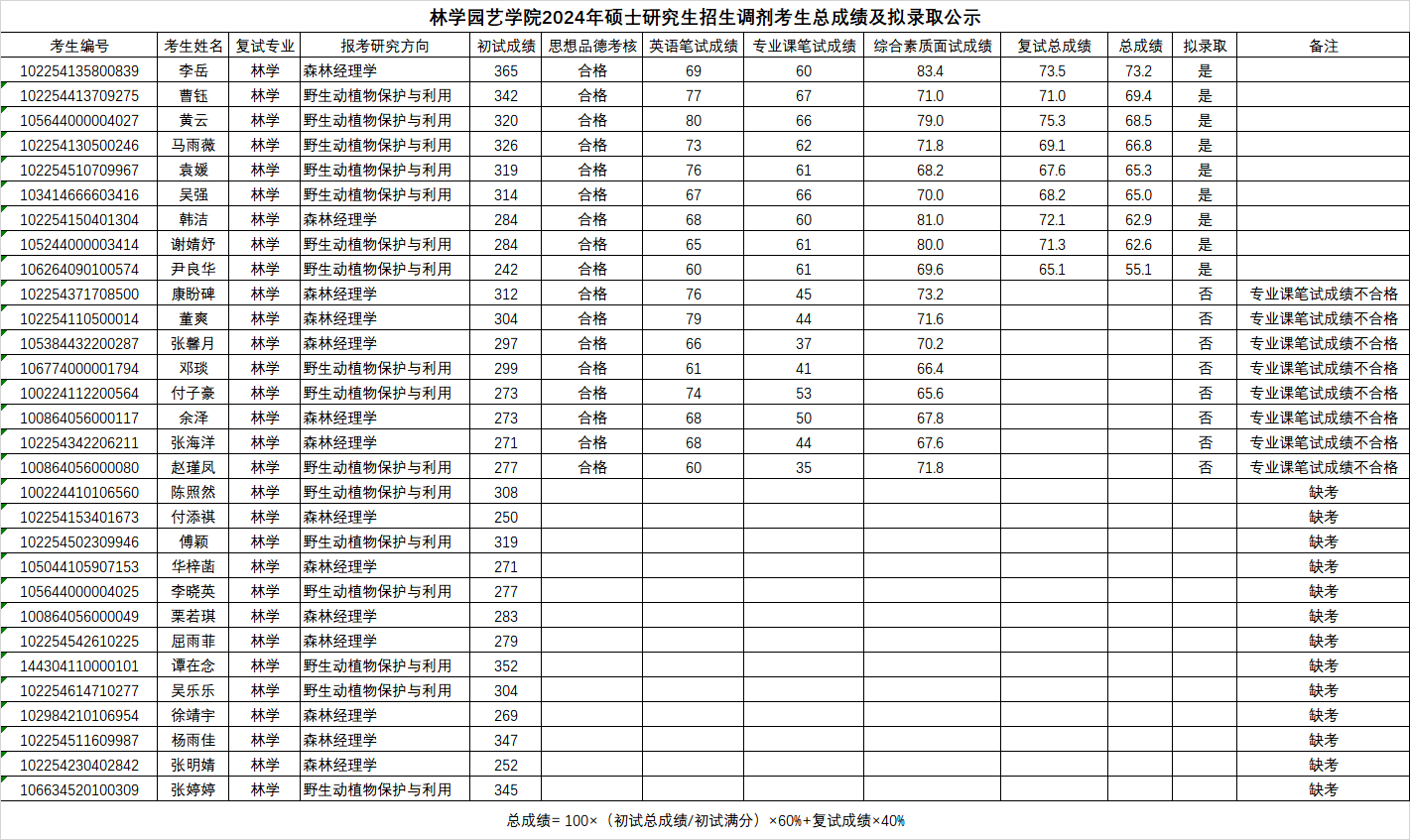 林学园艺学院2024年硕士研究生招生调剂考生总成绩及拟录取公示