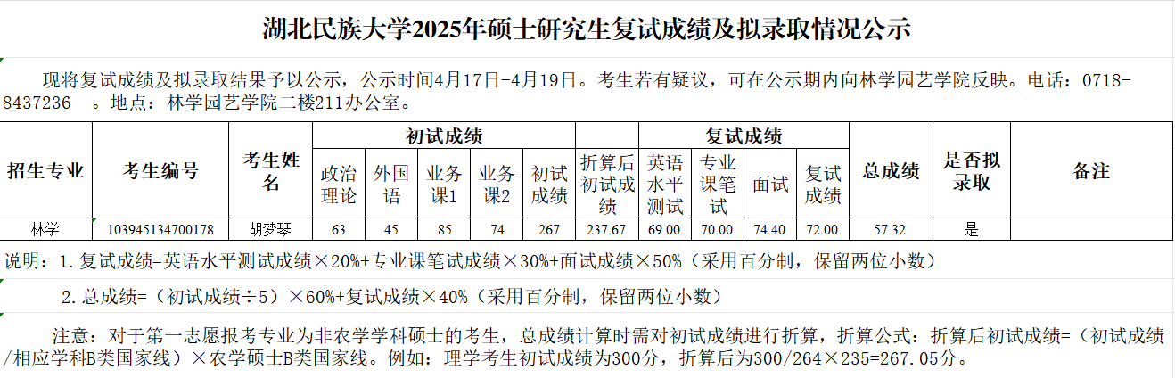 林学园艺学院2025年硕士研究生招生复试成绩与拟录取名单公示(第二轮调剂)