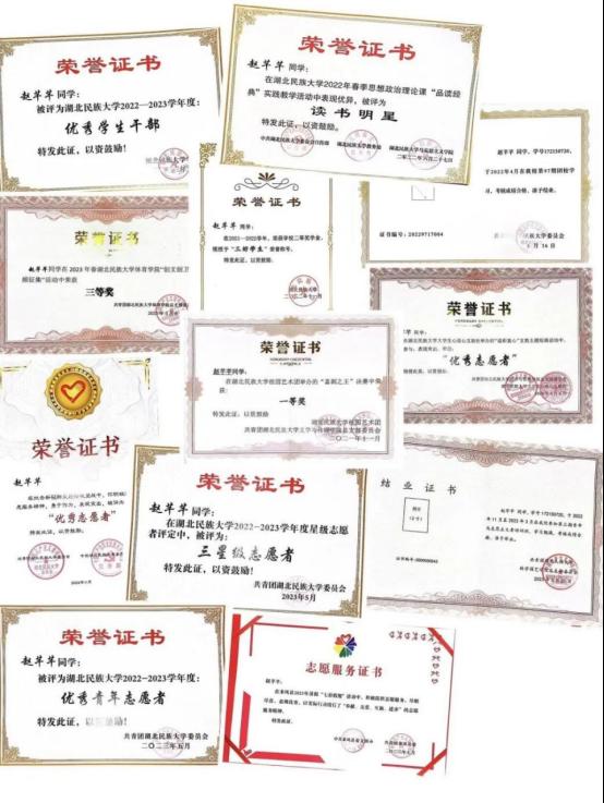 2021级城乡规划专业赵芊芊学习成绩和综测成绩连续两年为班级第一,多次被评为三好学生、优秀学生干部,获得四次以上的校级奖章,曾获外联社-国才杯大学生英语写作大赛校级一等奖,入选全国大学生英语竞赛国赛,参与林学杯获得校级铜奖,曾为省级创新创业项目负责人,并于2023年以第一作者发表两篇省级文章;参加志愿服务活动,其志愿时长已经达到150个小时,在抗击疫情期间被评为优秀志愿者,获得三星级志愿者、优秀青年志愿者称号;参与暑期社会实践团队“远山的红叶”成功入选团中央七彩假期示范团队、圆梦工程及校级团队。