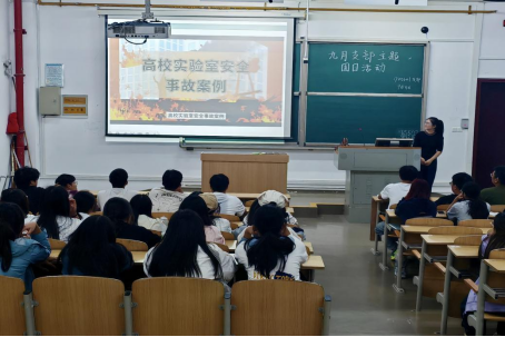 随后,李娟老师围绕实验室四大类危险源展开系统讲解:在火灾风险方面,她介绍了灭火器的正确使用方法及火灾逃生要点;针对化学试剂,她梳理了危险化学品分类标准,解析了典型危险物质特性,并多次强调“辨识试剂标签是保障安全的第一道防线”;就玻璃器械与仪器使用,她明确了规范操作流程与注意事项;对于生物与辐射类危险源,她则详细讲解了相关安全管理细则与防护要求,帮助新生全面掌握风险防控要点。