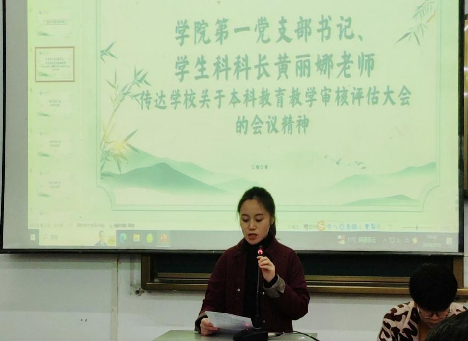 黄丽娜传达了3月7日学校本科教育教学审核评估大会会议精神。倡导同学们要站在事关学校发展全局的高度,充分认识审核评估工作的重要性,认真学习,积极参与。