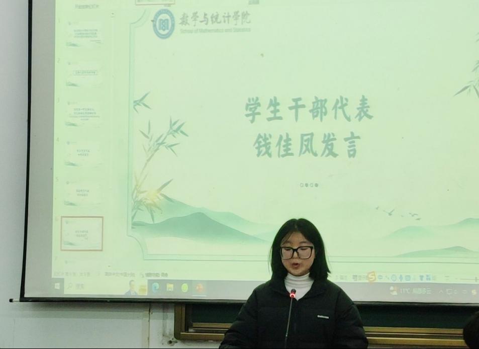 郑敏作了题为《人勤春来早  奋斗正当时》的动员报告,她从“什么是审核评估,审核评估对同学们的影响以及怎样积极参与审核评估工作”两方面,解读了审核评估的相关要义,如何迎接教育教学评估进行了工作指导,并对学生干部的工作提出了三点要求。一是不忘初心,主动激发学生干部的原生动力,用有限的时间获得个人成长的最大进步,为学校的发展、为国家繁荣和民族复兴贡献自己的青春力量;二是责任上肩,以德为先,实干为要,脚踏实地,干练干净;三是积极践行,充分发挥学生干部的桥梁纽带和榜样带头作用,在本科教育教学审核评估工作中展现出数学与统计学院的优良风貌。