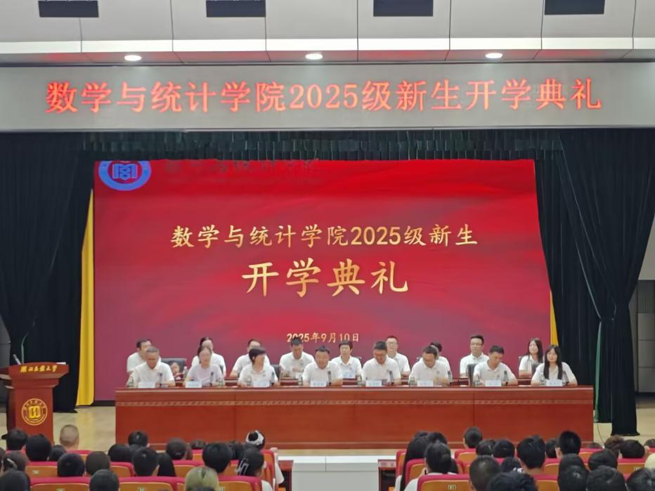 金秋九月,桂香沁人。9月10日晚,数学与统计学院2025级新生开学典礼暨本科生新生特色主题团日活动在行政楼一楼会议室隆重举行。适逢教师节,典礼更显意义非凡,为全体新生的大学旅程开启了崭新篇章。学院党总支书记、副院长魏代俊,党总支副书记、院长唐利明,党总支副书记郑敏,党总支委员、副院长向会立、方壮,特邀优秀校友代表涂晓璇,数学系、统计系系主任,各科室负责人,全体思政辅导员,2025级本科生班主任,以及2025级全体本科生、研究生和学院学生会、团委主要负责人出席典礼。本次典礼由学院党总支书记魏代俊主持。