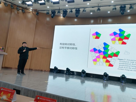 唐利明在活动现场宣布数学文化节的正式开幕,标志着一系列数学活动的启动。陈敬珊博士则为在场的师生带来了一场主题为“平铺中的数学”的科普讲座。他用浅显易懂的语言,结合有趣的视觉演示,向学生们介绍了平铺理论——这一数学分支研究如何使用重复图形覆盖平面而不留空隙或重叠。他的讲座不仅增加了学生对数学的认识,还激发了他们探索数学世界的热情。